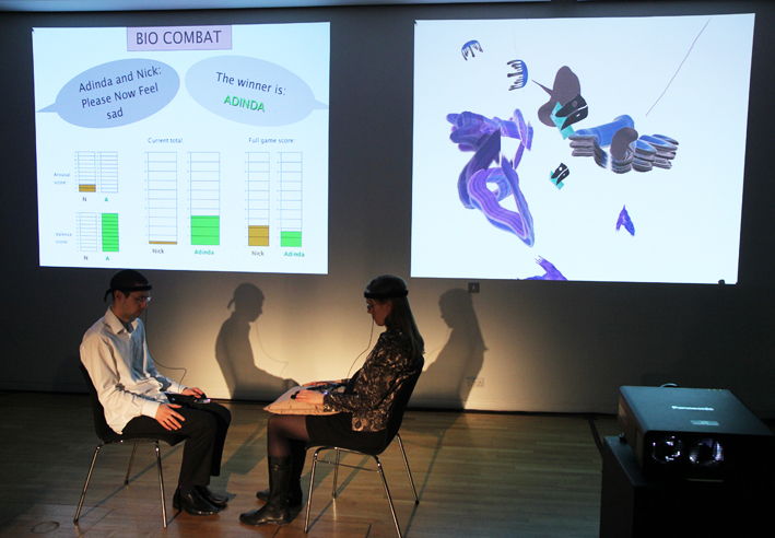 BioCombat is "played" by two performers whose heart rate, galvanic skin response and EEG data are tracked live. The left screen shows the game element of the piece: the computer demands a new emotion to be felt by the performers for each new one-minute interval, and after twenty seconds decides who is best at feeling the requested emotion. Points are scored when the correct arousal and valence are measured. This is then updated live until the next emotion is requested. The winner is rewarded by having their electroacoustic material play louder than their opponents'. The right screen shows animations that are meant to express the target emotion in an abstract way. This projection consists of two animated shapes: the left one uses features of the biosignals of the left performer to directly influence the animations and the right shape does the same for the right performer. Both animations are also using live features in the sound, such as loudness, rhythm, dissonance and frequency distribution in the energy spectrum.