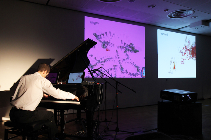 During the performance a computer agent improvises alongside the pianist following the emotions detected in the music. As the detected emotions change so will the animated graphics. The system is both aesthetically interesting and informative of musicians' expression of emotional state; it helps to highlight the problematic nature of emotion research and the ambiguities therein. A movie can be viewed here.