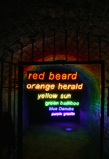 Heritage funding allowed Newcastle City Council to commission this responsive and site-specific sound and light installation for the Victoria Tunnel, a former coal transport tunnel used as an air raid shelter in World War 2 and listed as a nuclear shelter in the Cold War. For this artwork, Adinda van ‘t Klooster focused on the universal theme of war, by referring to the Rainbow Codes, a series of code words used by the Ministry of Supply (MoS) in the post-World War II period to refer to British military research projects. Poetic word combinations like purple granite, red beard and yellow sun are bent into neon signs that hang from the ceiling at the end of the tunnel. Each light is synced up with a short sound sequence. At the end of a ten-minute show the lights stay lit and the words form a neon rainbow across the curve of the tunnel.