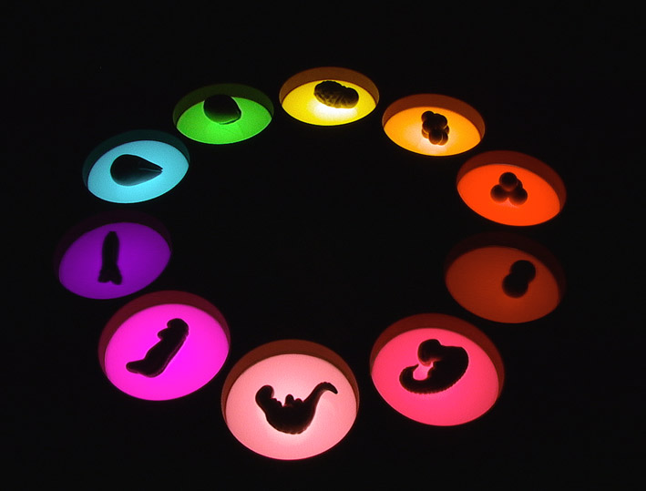 This interactive installation combines light, sound, sculpture and interactive technology. Shapes based on the first 28 days of a human embryo are placed in pools of coloured light inside flowerpots. When moved within the light, the shapes generate sounds based on what a fetus hears inside the mother's womb.