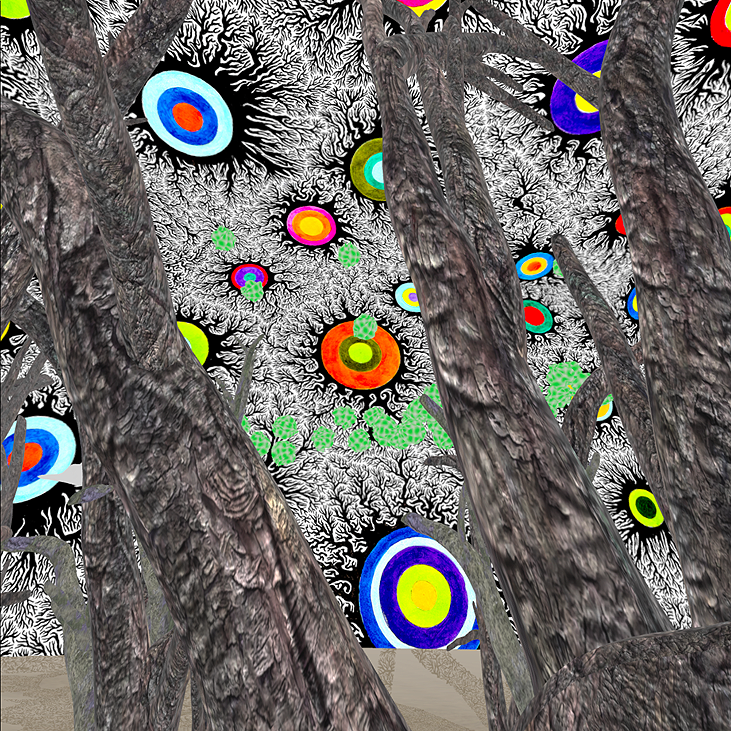 In VRoar, navigation is achieved by looking in a particular direction and pushing forwards with the controller; movement around the virtual world generates new tree objects. All the elements in a scene pulse and distort through expressive voice control. Blobs appear with each detected onset; these blend to a different texture depending on changes in chosen sound features and comic clouds distort and dance based on the sound you make. Pressing the ‘A’ button changes the background image and the sound feature the trunk and branches are responsive to and for how long they are responsive to it. The textures for the trees were created from pictures of trees and mosses I took in Jesmond Dene in Newcastle and around Marsden. Other sound responsive elements are the the blobs and clouds in the scene. The quirky and surrealist looking clouds have a small animation attached to them. If you make a sound they play through the movie file quicker or slower.